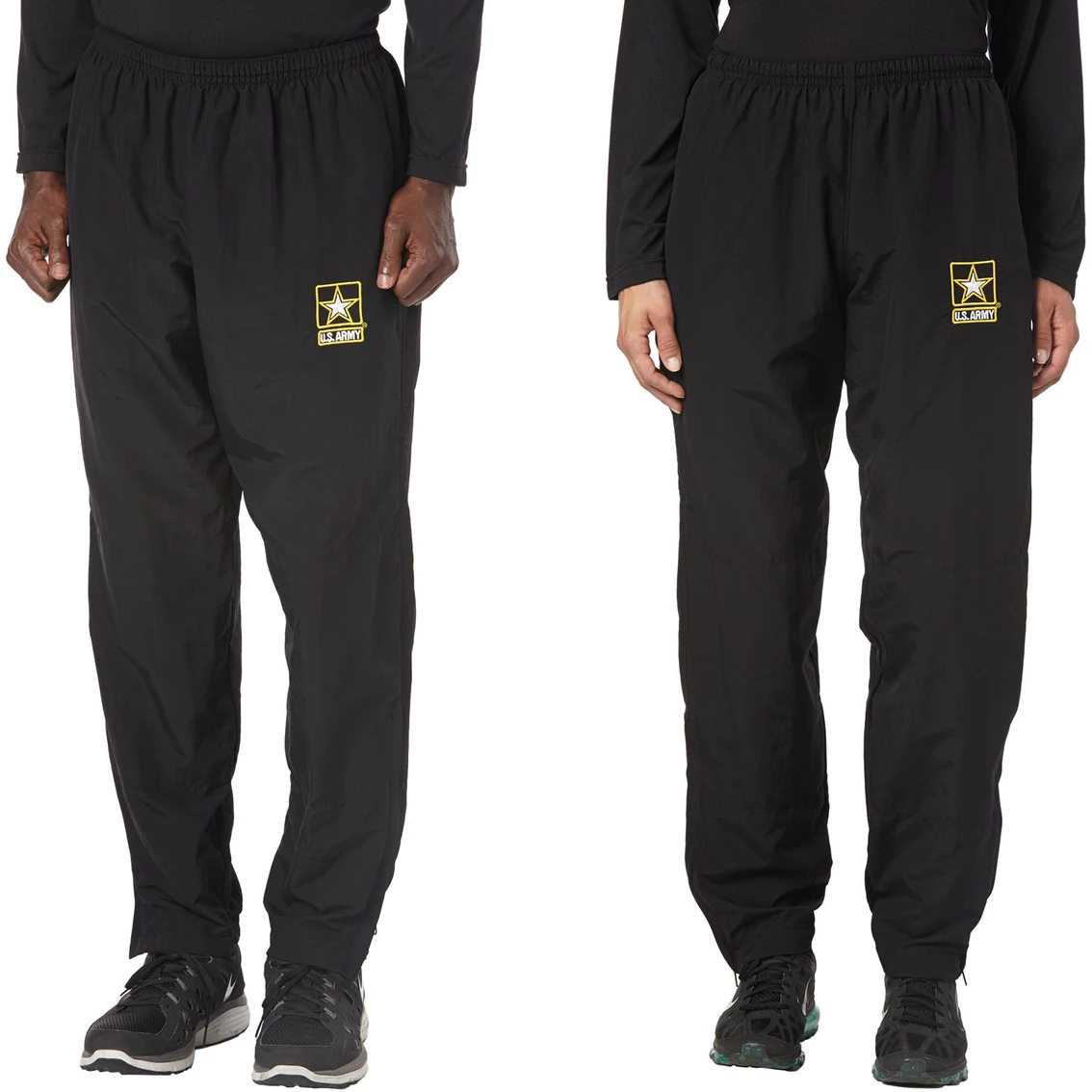 These DLATS APFU pants are black and unlined. The elastic waistband features a drawstring and barrel lock, half elastic at the ankles, two side pockets, slide fasteners for leg bottoms and the US Army Star Logo embroidered on the upper left thigh area. Style: 03988.